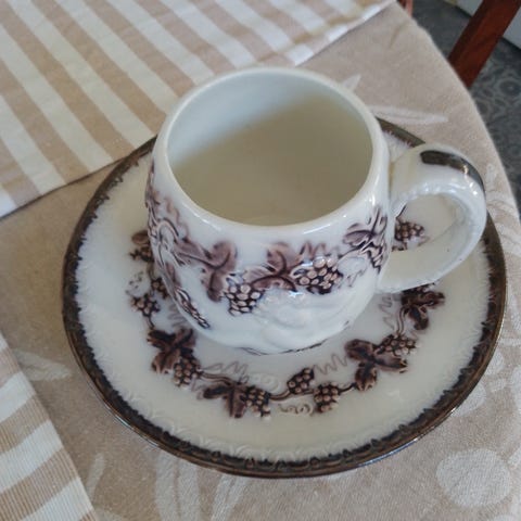 Miljögården kaffekopp med fat i brun keramik. Koppen har ett mönstrat yttre i bruna och vita toner och ett enfärgat brunt inre. Fatet är runt och brunt med glaserad yta. Passar för servering av kaffe, te eller andra varma drycker vid dukning i kök eller matsal. Koppen 8,5 cm i diameter.