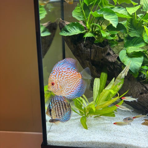 Hej! Jag har fyra diskus till försäljning, det är två st red alenquer och två st turquoise checkerboard. Red alenquer är troligtvis ett lekpar då de har lagt ägg, men det har inte blivit några yngel än så länge. Alla fyra säljs tillsammans för 8000kr.