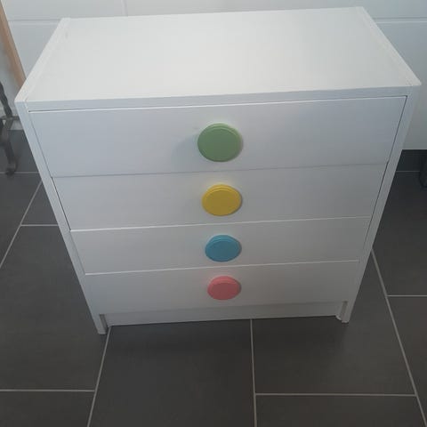 Byrån är stor och rymmer mycket kläder. Den har några synliga märken då den är använd sen ett tag tillbaka, men annars funkar den väldigt bra.