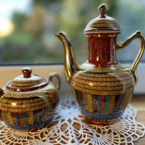 3, Mockakopp med guldkant med ett japanskt motiv, ofta kallad Geishaservis. Tillverkad i Japan i äggskalsporslin.