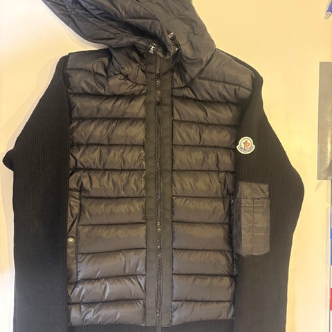 En Moncler cardigan o storlek M jätte bra skick men har ett litet hål i under armen men annars är de inget fel på den hör av er!