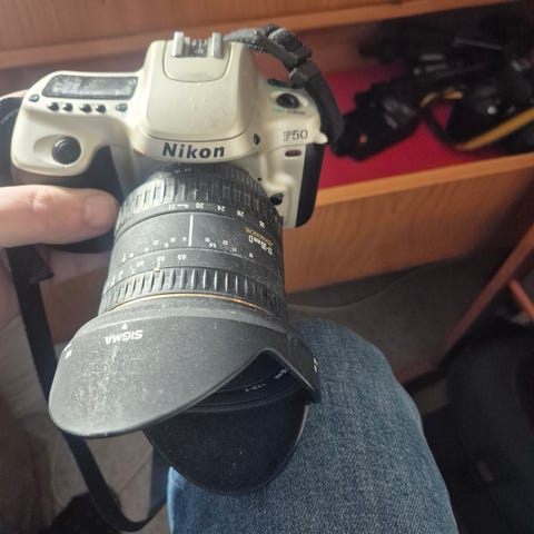 Nikon analog systemkamera med tillhörande zoomobjektiv. Kameran använder film och har utbytbar optik. På bilderna syns kamerahus med standardzoom samt ett extra telezoomobjektiv, vilket ger möjlighet att fotografera både motiv på nära håll och på längre avstånd. Kameran har rem med Nikon-logotyp. Passar för analog fotografering där man vill använda 35 mm film och manuella eller halvautomatiska inställningar beroende på kamerans funktioner.