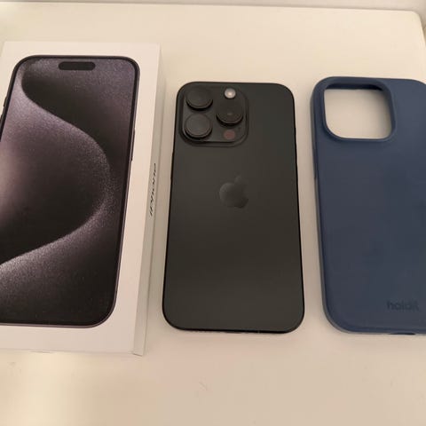 Apple iPhone 15 Pro mobiltelefon med 256 GB lagringsutrymme. Färg: vit titanium. Levereras i originalförpackning med laddkabel och dokumentation enligt bilder. Batterihälsa och övriga specifikationer framgår av skärmbilden. Två mobilskal medföljer, med olika mönster enligt bild.