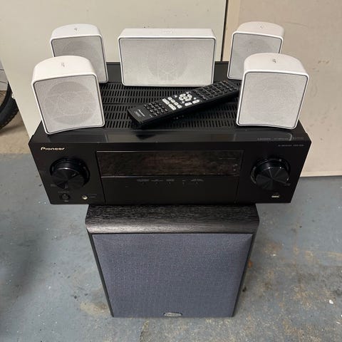 Pioneer VSX-829 hemmabiosystem i svart utförande. Systemet består av en hemmabioreceiver med frontpanel i svart, flera anslutningsmöjligheter på baksidan (ej synliga i bild) samt medföljande fjärrkontroller. Till systemet hör även flera fristående högtalare och en separat subwoofer i svart. Lämpligt för användning tillsammans med tv, film- och musikuppspelning i vardagsrum eller liknande miljöer där flerkanalsljud önskas.