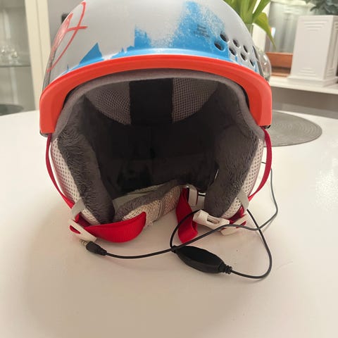 Orange skidhjälm med hårt yttre skal och öronlappar. Hjälmen har ventilationsöppningar upptill och baktill samt justerbart band under hakan och justerskruv bak. Baktill finns fäste för skidglasögon. Passar för skidåkning och snowboardåkning.