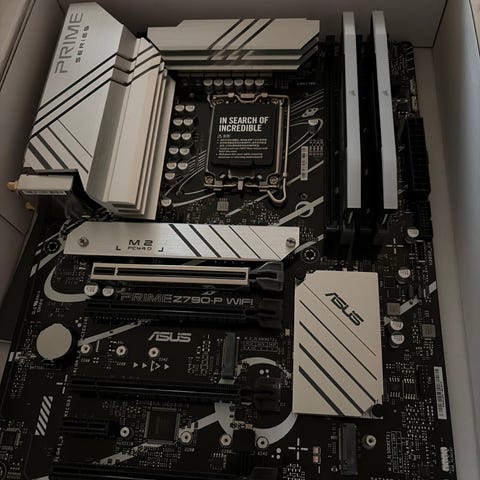 Moderkort Gigabyte Z790 Aorus Elite AX: Inget speciellt att säga om detta kort mer än att det är ett stabilt kort som är upplåst för att överklocka eller undervolta och har inga begränsningar. har fungerat hur bra som helst. Originalkartong medföljer