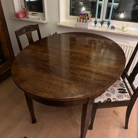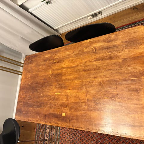 Detta är ett stort massivt träbord i äldre stil, troligen tidigt 1900-tal.