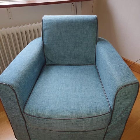 Fåtölj i blått. Fint skick men sliten på armstödens framkant.