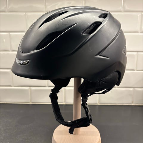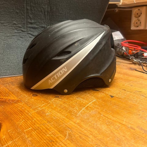 Action hjälm i svart färg. Hjälmen har ventilationsöppningar upptill och en silverfärgad detalj på sidan med texten "Action". Passar för cykling eller liknande aktiviteter där huvudskydd behövs. Justerbar passform beroende på storlek och huvudform via spännen/remmar (ej närmare angivet).