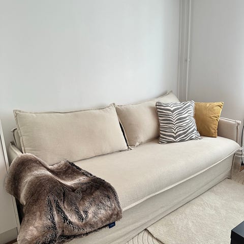 Avtagbar och tvättbar klädsel (60% bomull, 40% linne). Färg Tristan Stone.