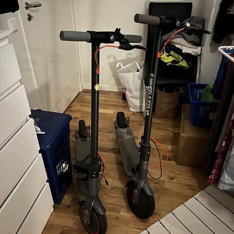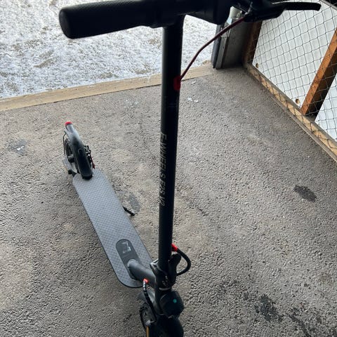 Elsparkcykel i svart färg. Modellen har ståplatta, styre med handtag och broms samt fram- och bakhjul anpassade för stadskörning. Elsladd och laddare syns på bilderna.