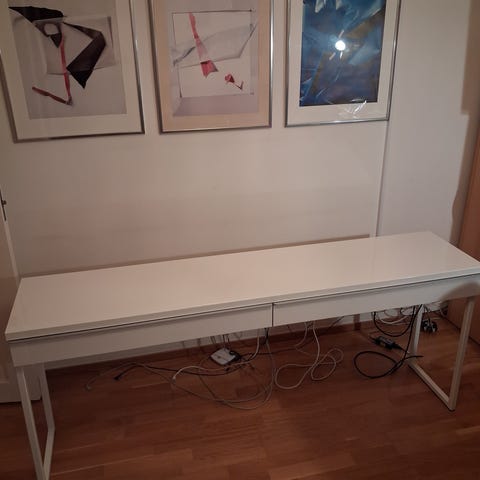 IKEA skrivbord i vitt utförande. Lång, smal bordsskiva som passar bra längs en vägg eller under ett fönster. Utrustat med flera utdragslådor för förvaring av kontorsmaterial eller andra mindre saker. Lämpligt som arbetsplats för datorer eller studier i hemmiljö eller kontor. Hämtas i Stockholm.