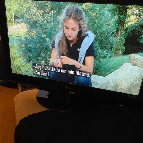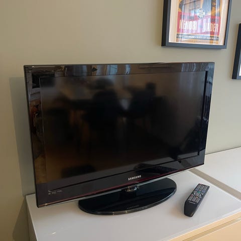 Saknar fjärrkontroll men kan styras via själva TVn. Det finns en mindre skada på sidan, men inget som påverkar inte bild.