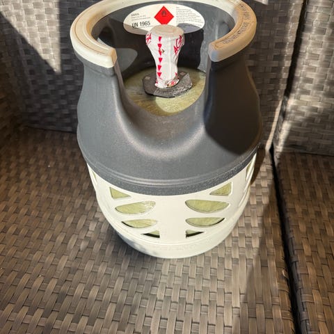 Gasolflaska i kompositmaterial. Flaskan har bärhandtag upptill och skyddande ytterhölje med öppningar runt om. Passar för användning till exempelvis grill, husvagn eller båt, beroende på anslutning och regulator som används. Exakt volym och mått är inte angivna.