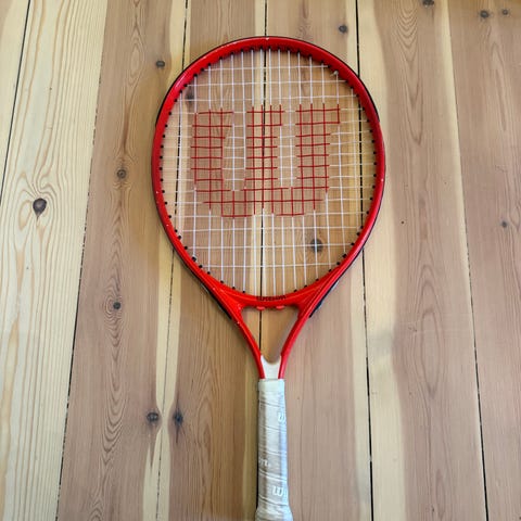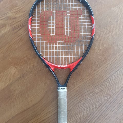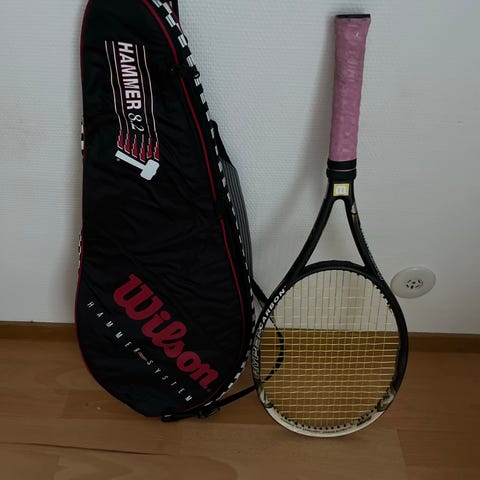 Babolat tennistracket med fodral. Det är 21 tum vilket är rekommenderat för barn i åldern 5-6 år. Racketen har svart ram med gula detaljer och rosa grepp. Kan dock lindas om med en ny linda av valfri färg.