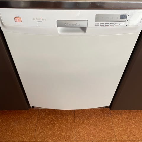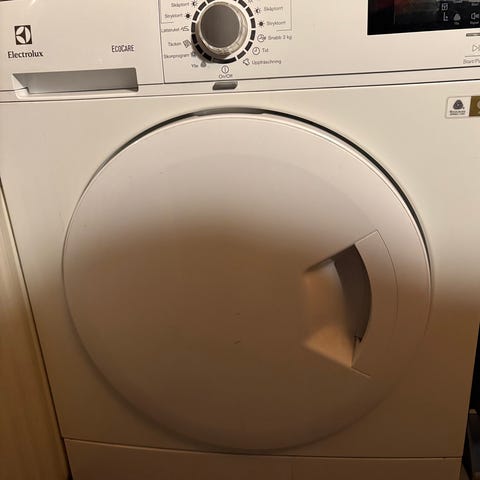 Electrolux frontmatad tvättmaskin i vit färg. Maskinen har frontlucka med glas och rostfri trumma. Panel med vred för programval och knappar för inställningar. Tvättmedelsfack på framsidan. Lite skadad vit tvättmedelsfacket men annars fräsch och fungerar bra.