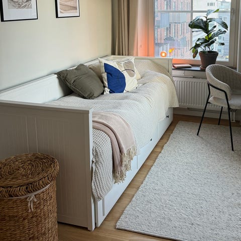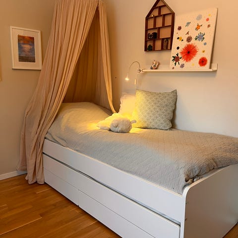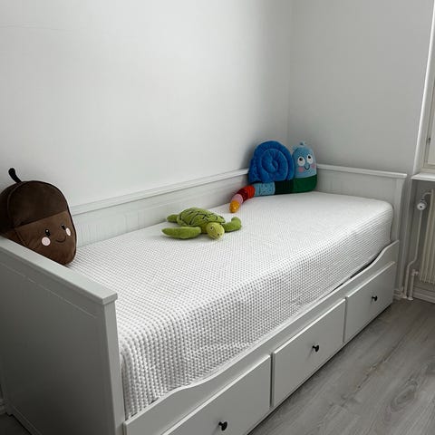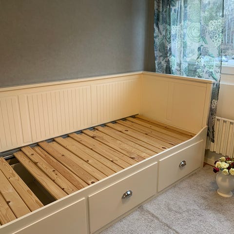 IKEA dagbädd med förvaring i vit färg. Sängen har utdragslådor undertill som ger extra förvaringsutrymme för till exempel sängkläder, leksaker eller kläder. Dagbädden kan användas som soffa dagtid och som säng nattetid och passar i sovrum, barnrum eller gästrum.