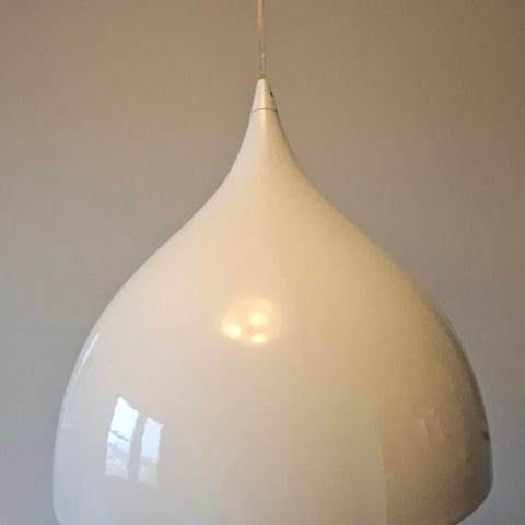 Vit kökslampa i metall säljes. Den har använts i flera år, har något litet märke, men fungerar som den ska och jag har själv aldrig stört mig på märkena.