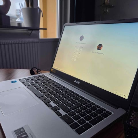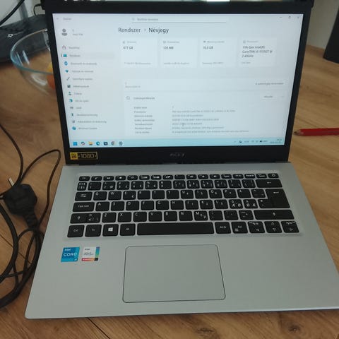 Acer bärbar dator i silverfärg. Datorn har inbyggd webbkamera ovanför skärmen och ett tangentbord i fullstorlek med styrplatta. Undersidan visar gummifötter för stabilitet vid användning. strömkabel ingår. Lämplig för vardagliga uppgifter som webbsurf, kontorsarbete och enklare studier beroende på installerad hårdvara och programvara.