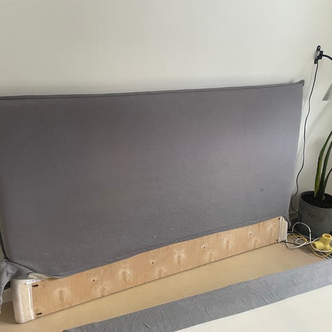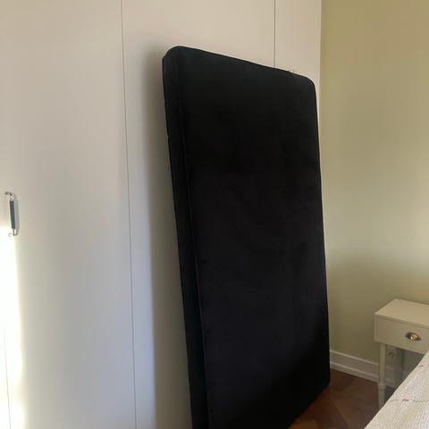 Mio sänggavel i grå textilklädsel. Gaveln har en vadderad, knapptuftad design med rutmönster som ger ett mjukt intryck och bekvämt stöd när man sitter upp i sängen. Passar som huvudgavel till säng och kan placeras mot vägg bakom madrass och sängram. Har ben och står stabilt.