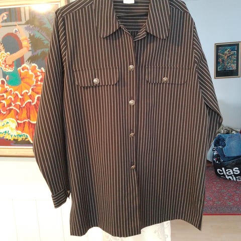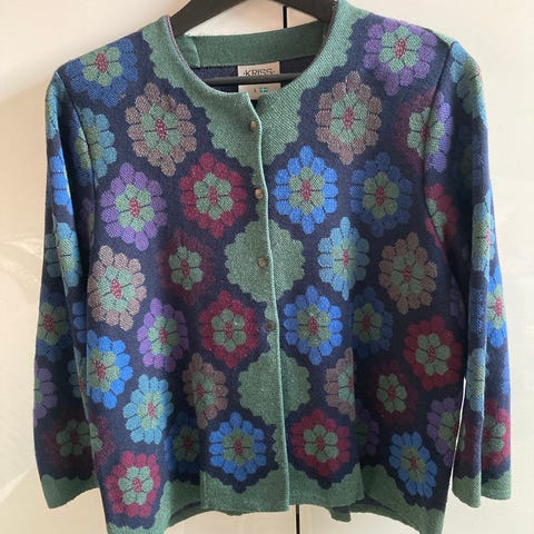 Kofta för dam i storlek L. Ljusgrön färg med lodräta ränder och v-ringning. Modellen är längre med knäppning framtill och två fickor. Passar som vardagsplagg eller som extra lager över topp eller klänning.