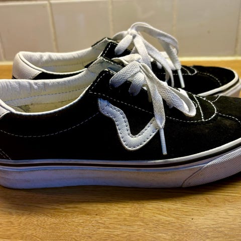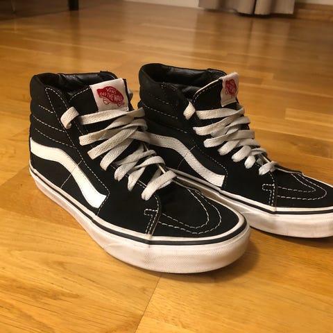 Vans Old Skool sneakers i storlek 37. Skorna är svart/vita med vit sula och vita skosnören. Klassisk modell med sidostripes och vulkaniserad gummisula med våffelmönster. Passar till vardagsbruk och fritid.