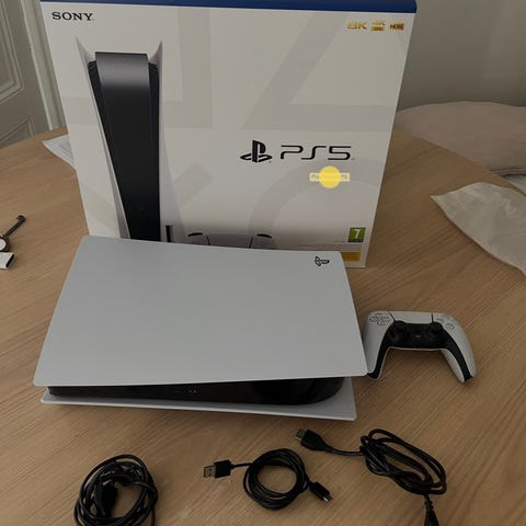 Sony Playstation 5 spelkonsol i vit färg. Konsolen har optisk skivenhet på framsidan och flera anslutningar på baksidan, bland annat USB-portar och HDMI-utgång. I bilderna ingår två trådlösa handkontroller i matchande vit och svart färg av DualSense-typ. Konsolen är avsedd för hemmabruk och ansluts till TV eller bildskärm via HDMI. Strömförsörjning sker via nätkabel på baksidan av enheten.
