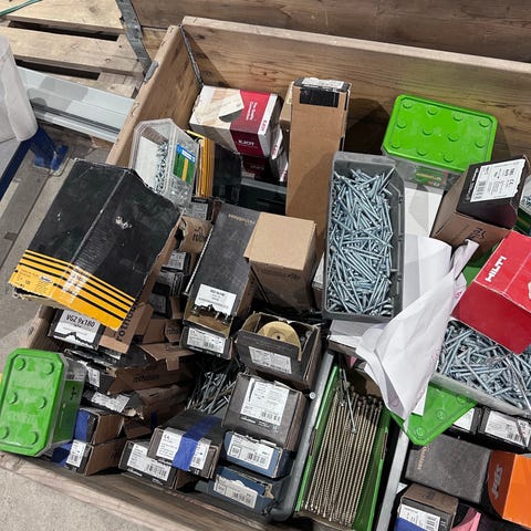 Förvaringslåda i grön metall med flera insatsfack anpassade för sortering av skruv, plugg och mindre beslag. Lådan har handtag på kortsidan för enklare hantering och kan användas i verkstad, garage eller förråd för organiserad förvaring av smådelar. Insatsfacken är löstagbara och ger översiktlig struktur över innehållet.