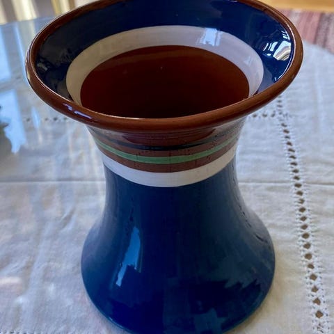 Vacker ljusstake / vas från Nittsjö keramik i teracottafärgad glasyr bord blå blommor.