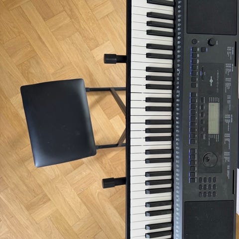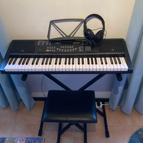 Denna keyboard är helt ny, den är använd ett par gånger men den är som ny. Det finns inga märken som visar att den är använd och den fungerar väldigt bra. Den har många olika funktioner som massa olika ljud och ett eget bord för piano med sin lilla pall. Dessutom så ingår det hörlurar, och den kan både vara på el och på batterier så du kan ta med dig den vart du vill och spela vart du vill.