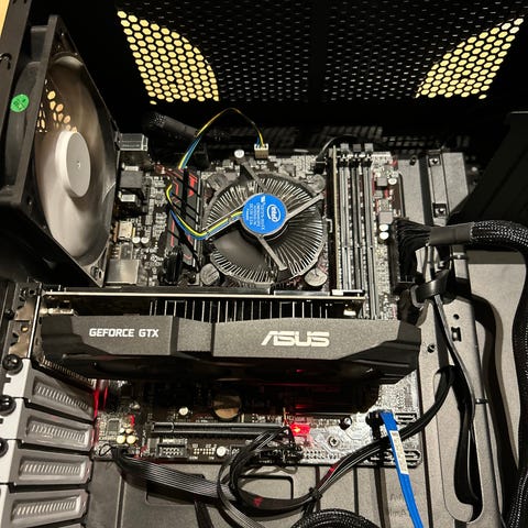 Intel Core i3-7100 processor. Stationär CPU med sockel för Intel-plattform. På bilderna syns även en Intel originalkylare med fläkt och kylfläns som kan användas för luftkylning av processorn, samt ett separat grafikkort från MSI av Aero-serien GTX 1050Ti 4gb.