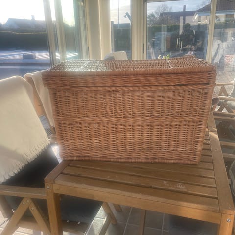 IKEA korg med lock i brun rotting. Rektangulär modell med gångjärnsförsett lock och spänne framtill.