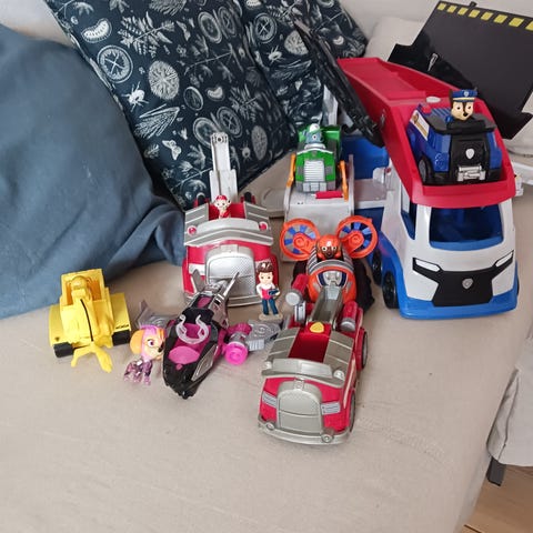Lego City leksaksfordon. Setet på bilden visar flera olika fordon, bland annat utryckningsfordon och personbil, byggda av Lego-klossar. Passar för lek med stadsmiljö och räddningstjänstscenarier tillsammans med andra Lego City-set.