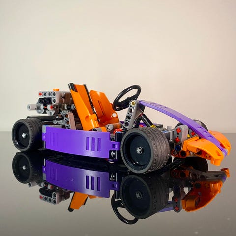 Lego Technic gokart i orange och lila färger. Byggsats med rörligt framhjulssystem och detaljerad förarplats. Passar för bygglek och som utställningsmodell för den som gillar tekniska Lego-fordon.