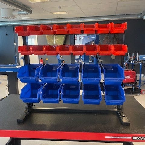 Bultfack med skruv, mutter och brickor, på fot.