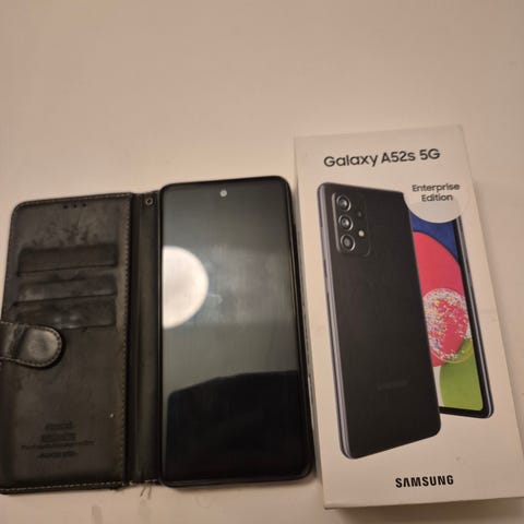 Samsung Galaxy A-53 mobiltelefon med 128 GB internminne. Telefonen visas i svart färg och har flera bakre kameror enligt bilderna. Passar för vardaglig användning som samtal, meddelanden, surf och appar. På bilderna syns även ett genomskinligt skyddsfodral som kan ingå om säljaren önskar. Ingen ytterligare information om skärmstorlek eller andra specifikationer är angiven.
