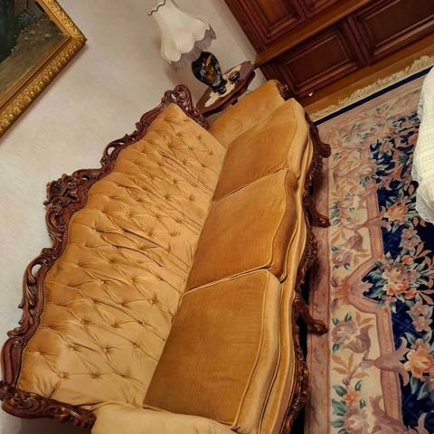 Säljer en soffgrupp i mycket hög kvalitet (Victorian Rococo Revival-stil), privatimporterad från Italien för ca15 år sedan för 70000kr (exclusive transporten). Möblerna är handgjorda i massivt trä och har inga chip, märken eller skador. Tyget är av mycket hög kvalitet och det finns inga reparationer eller lösa spikar någonstans. Möblerna har alltid bevarats under lakan, så det finns inga solskador eller missfärgningar på vare sig träet eller tyget. Mycket få människor har suttit i dem, så kuddarna är helt oskadade och utan tecken på nedskjutningar.