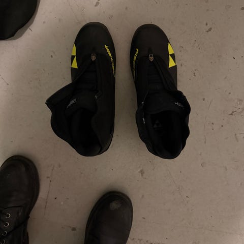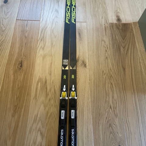 Fischer längdskidor i svart och gul färg. Skidorna är utrustade med bindningar och lämpar sig för längdskidåkning. Passar för användning i preparerade spår och träning eller motion på snöunderlag.