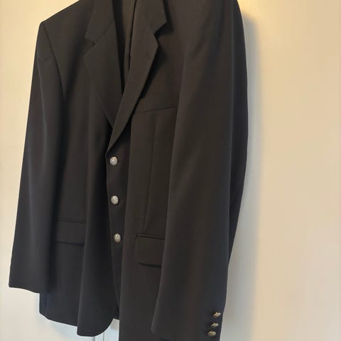 Kavaj för herr i storlek 52. Färgen är blå och materialet är merinoull. Klassisk modell med slag, framfickor och knäppning framtill. Passar till både vardag och mer formella tillfällen.