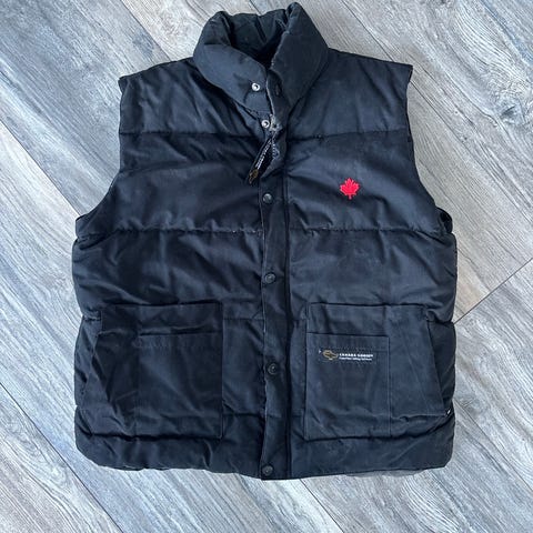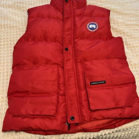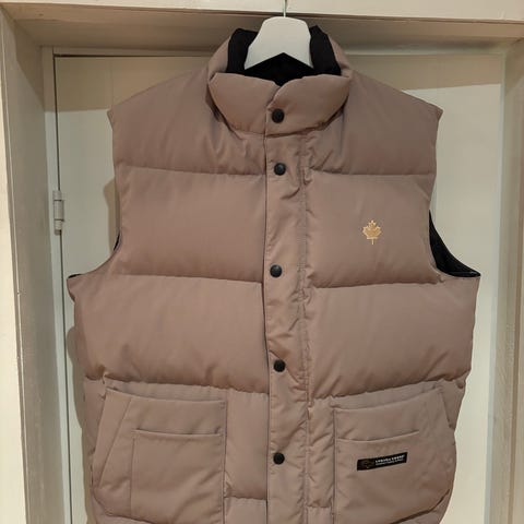 Canada Goose dunväst i storlek L. Västen är brun med mörk insida och har hög krage. Flera ytterfickor framtill samt innerficka. Fyllning i dun ger god isolering och passar som ytterplagg eller som extra lager under jacka vid kallare väder.