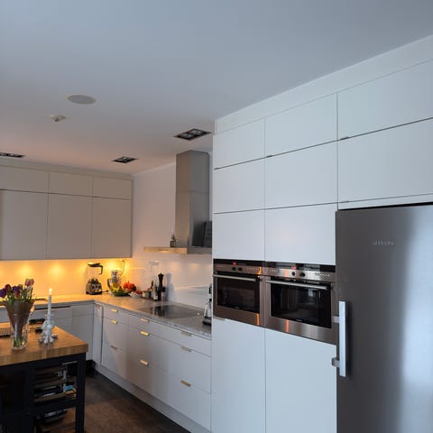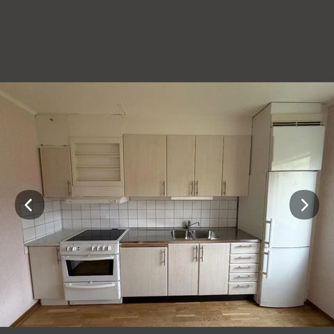Alla stommar är väldigt fina, luckor och lådfronter däremot ganska slitna (se bilder). Alla vitvaror funkar bra. Kylskåpet har ett trasigt handtag.
