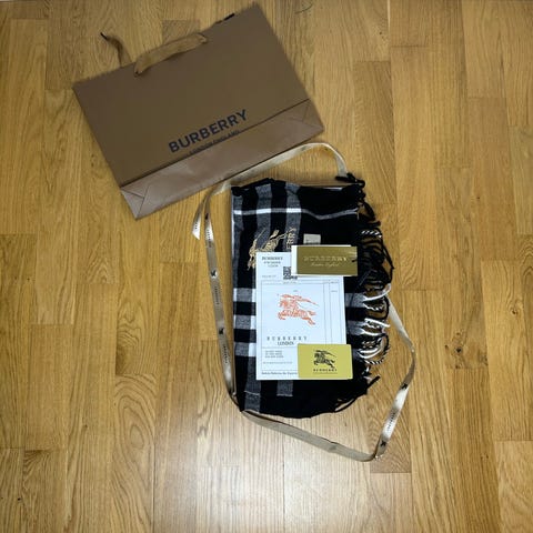 Helt ny Burberry kashmirsjal i färgen Bridle Brown med vävt TB Monogram jacquardmönster.