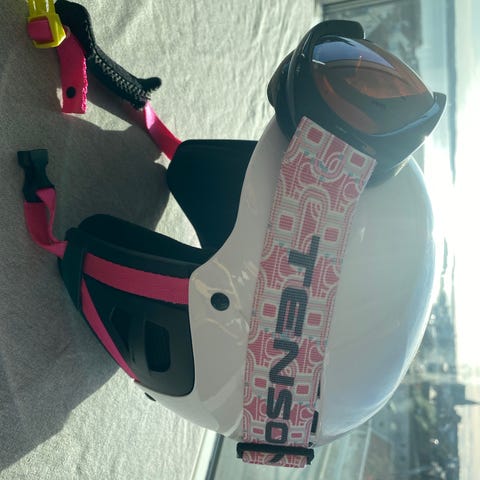Fräsch skidhjälm för den yngre åkaren. Fäste för go-pro kamera eller liknande för den som vill visa mormor hur grym man var i backen.