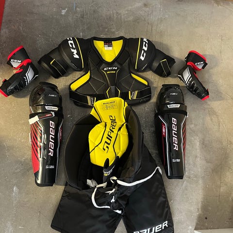 CCM Bauer hockeyutrustning set senior. Utrustningen inkluderar bland annat skydd från CCM i storlek small (senior) samt Bauer X600-skydd. På bilderna syns även hockeybyxor, matchtröja och övriga skydd samt en större hockeyväska för förvaring och transport av utrustningen. Passar för ishockeyträning och matchspel för större juniorer. Färgerna på plaggen och skydden är blandade, bland annat vitt, gult, blått, rött och svart beroende på del i utrustningen.