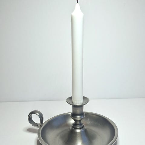 En ljusstake för kronljus eller batteri ljus som hänger från taket. Den är gjord av metall, troligen tenn.