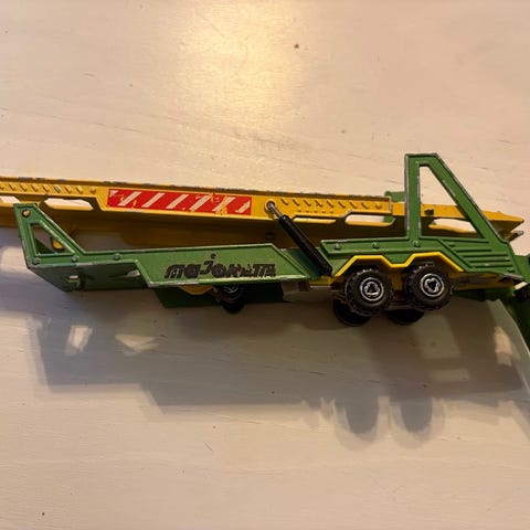 Säljer en rolig leksak från min barndom. Att det gick att frakta bilar i två plan var mäktigt då som nu. Modellen är en Matchbox K-10 Super Kings Car Transporter och av engelsk tillverkning. Baklämmen kan fällas ned och det övre planet kan höjas och sänkas för av- och påkörning. Det finns plats för totalt fem bilar på släpet. Dragbilen kan kopplas på och av.