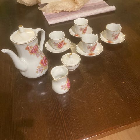 Dockservis i porslin med blommigt mönster. Setet innehåller tekanna, sockerskål, gräddkanna, koppar med fat samt assietter. Passar för servering av te eller kaffe i hemmet eller vid mindre bjudningar.