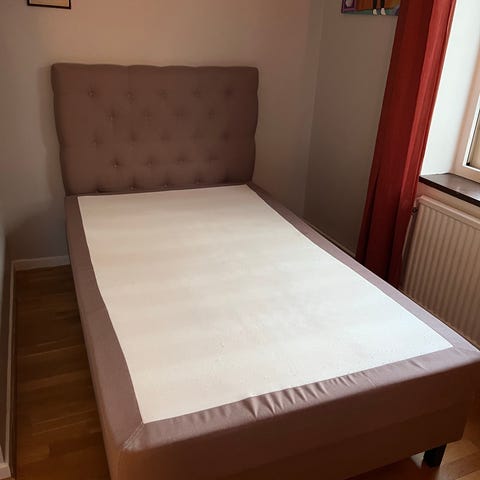 Mio säng Roma 120x200, underbädd kontinental, resårkassett och bäddmadrass. Har varit gästsäng och sparsamt använd. Madrassskydd och sängkappa kommer med.