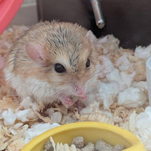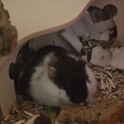 Söker du en ny bästa vän? Här är Freja, helt tam, hon är van vid barn och älskar att vara i handen. Söker ett hem där hon får vara bara sällskap och ska få slippa att avlas på mer. Född 11/24. Färgen är safir, arten hybrid (kallas "sibirisk dvärghamster" i djuraffär).