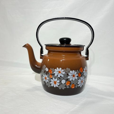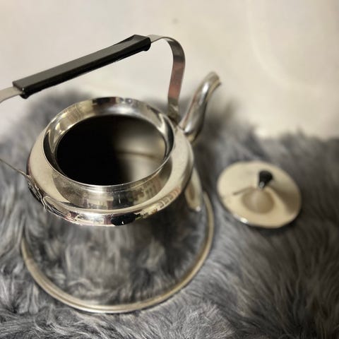 Klassisk svensk 1950-tals rostfri kaffekanna med svart ebonithandtag, Nils Johan Hollywood. Totalbredd 23 cm, höjd 16.5 cm, kannans botten 13 cm i diameter. 650 gram plåt. Nötningar, litet "osynligt" in-tryck på en sida.